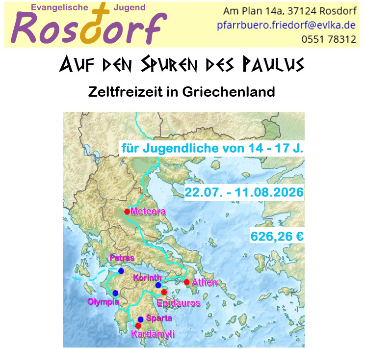 FAHRT: mit Kleinbussen; Rückfahrt: Fähre Patras - Ancona UNTERNEHMUNGEN: die einzelnen Angebote und Tagestouren werden mit den Teilnehmenden verabredet TEILNEHMERBEITRAG: 626,26 € (knallhart kalkuliert) (Sollte deine Familie Probleme bei der Finanzierung der Freizeit haben, melde dich vertrauensvoll bei der Freizeitleitung. Wir helfen gerne dabei, Unterstützungsmöglichkeiten zu finden - am Geld soll eine Teilnahme nicht scheitern.)